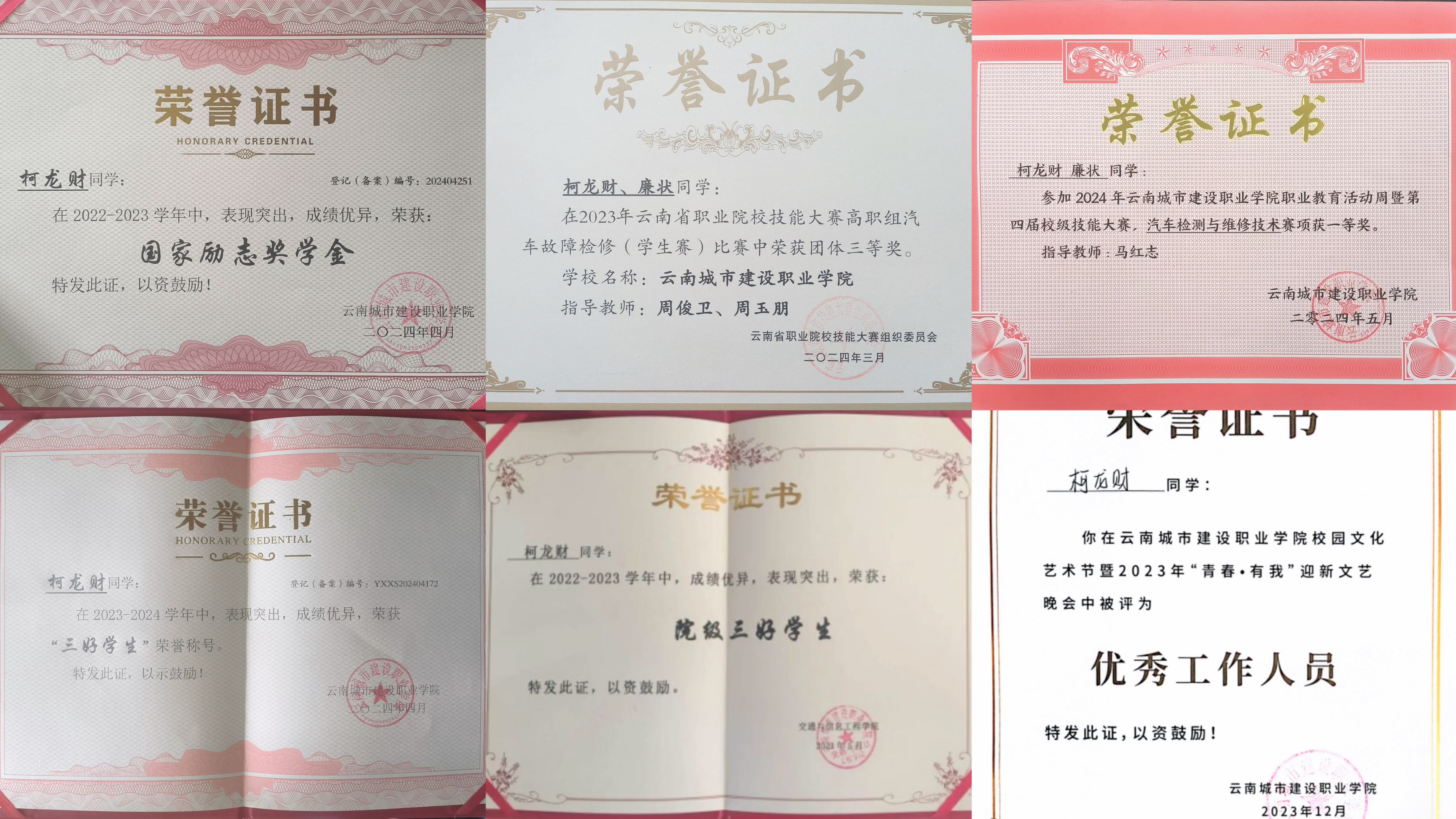 柯龙财同学始终保持着踏实勤勉的求学态度,凭借扎实的专业知识和出色的学习成绩,先后获得“国家励志奖学金”和校级“三好学生”等荣誉。同时,他积极投身专业相关的学科竞赛和实践活动,在全国智能机器人应用赛中,主导智能小车的基础搭建、电路设计与调试,为团队顺利完成比赛贡献了特别力量;并连续两年参与汽车维修技能大赛,先后荣获校级“一等奖”、省级“三等奖”,在各类技能竞赛中不断精进整车故障诊断、发动机拆装等核心技能。