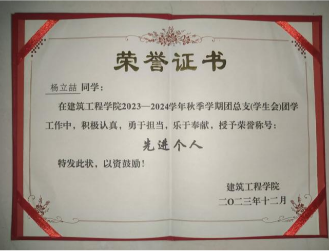 ▲杨立喆同学荣获学院团总支“先进个人”