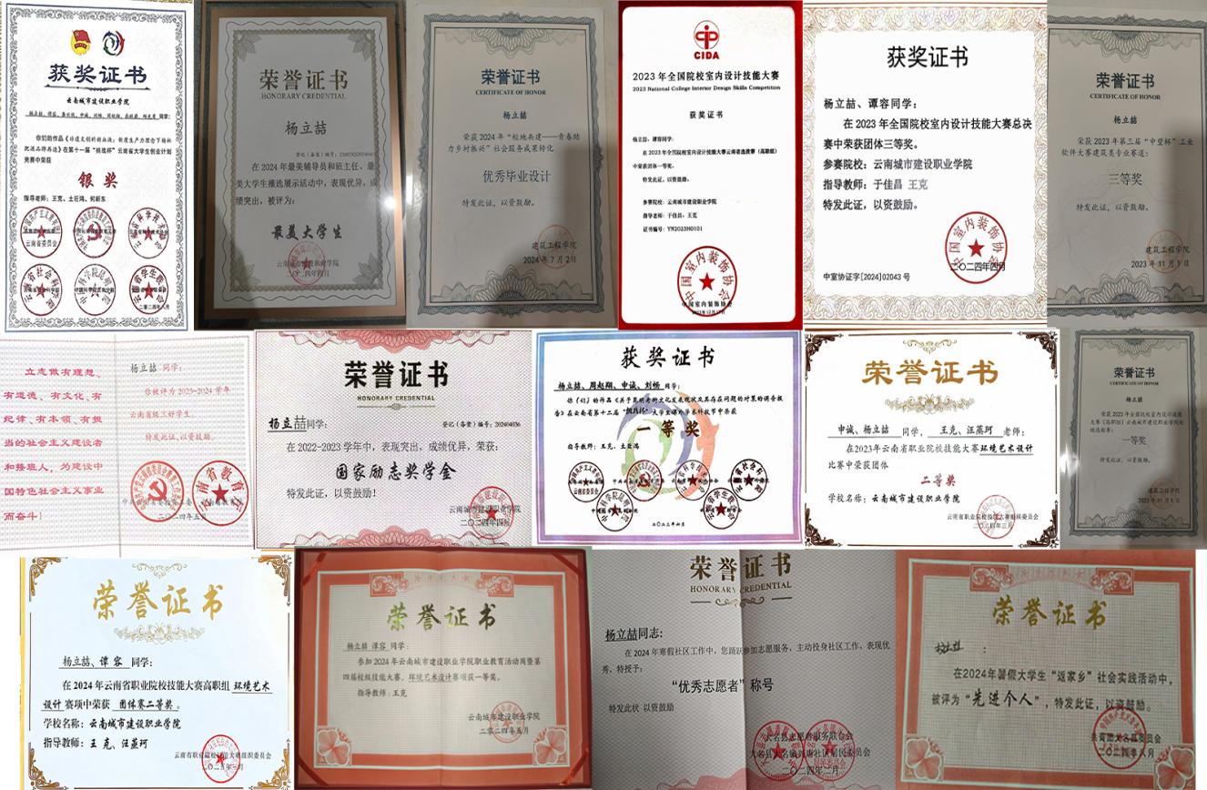 杨立喆同学积极参加各类学科竞赛和活动,不断提升自身综合素质,获得云南省第十二届“挑战杯”大学生课外学术科技节“一等奖”。同时,在各项团体赛中,不论是参与其中还是作为项目负责人,他都积极与团队成员密切合作、不断挑战自我、攻克各种难题,曾先后荣获云南省职业院校技能大赛环境艺术设计比赛团体“二等奖”、2023年全国院校室内设计技能大赛团体云南省“一等奖”和全国“三等奖”、第十一届“挑战杯”云南省大学生创业计划竞赛团体“银奖”等奖项。