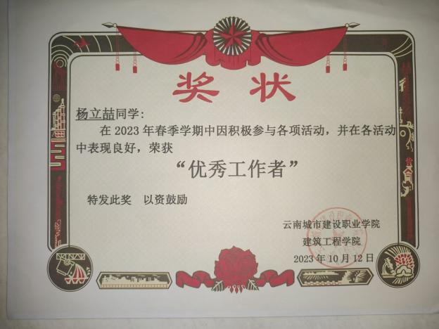 ▲杨立喆同学荣获学院团总支“优秀工作者”